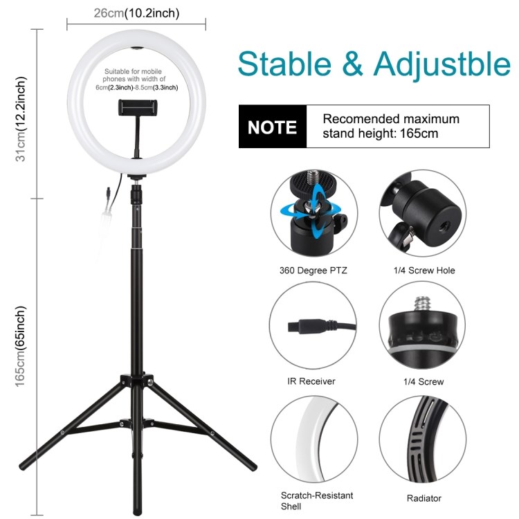 1. LED ring light can be mounted on the holder and take it anywhere, it can also be removed from the stand at any time, the tripod ball head can 360 degree rotating can free to adjust to any angle.