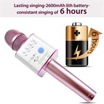 The microphone has a battery LED indicator which goes off upon charging and you have approx. 6 hours of song in one charge. Compatible with iOS and Android and can be used with iPhone, iPad, iPod, PC, Samsung and other Bluetooth enabled devices. The microphone is stored in a beautiful black case with a carabiner for hanging.