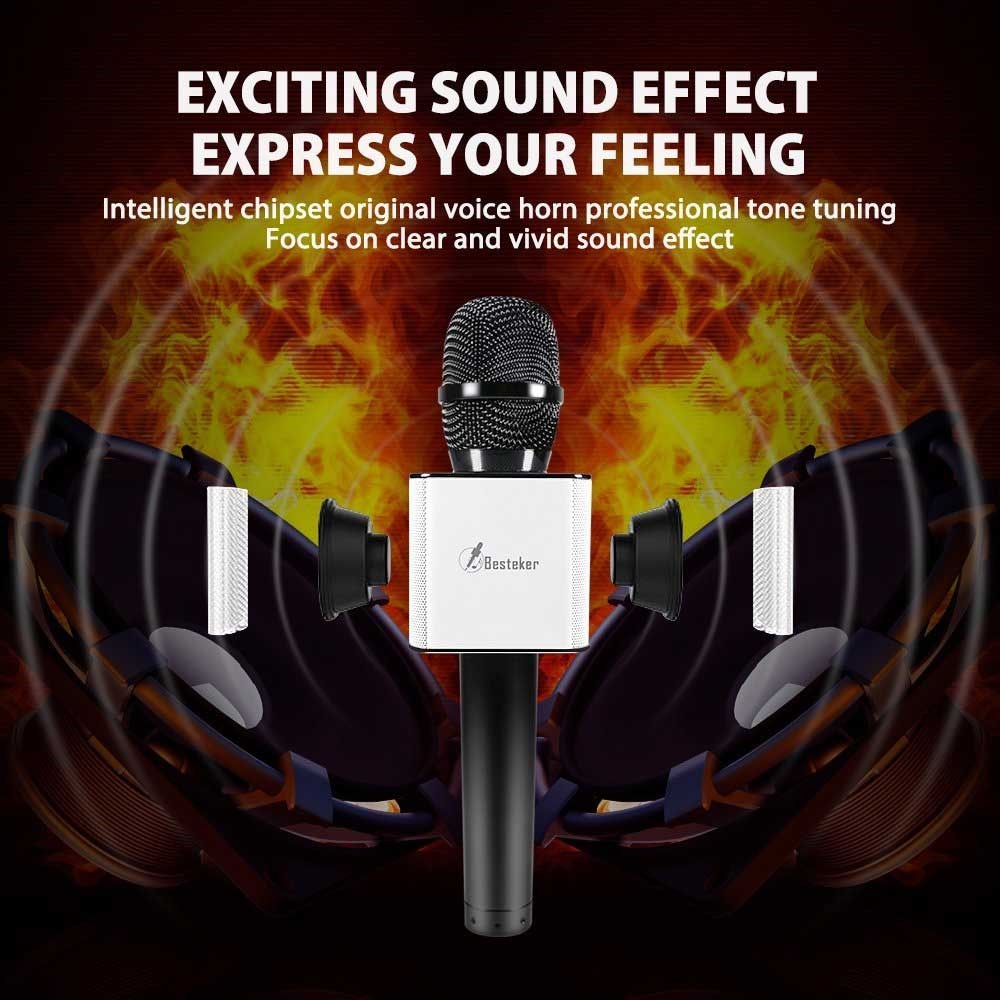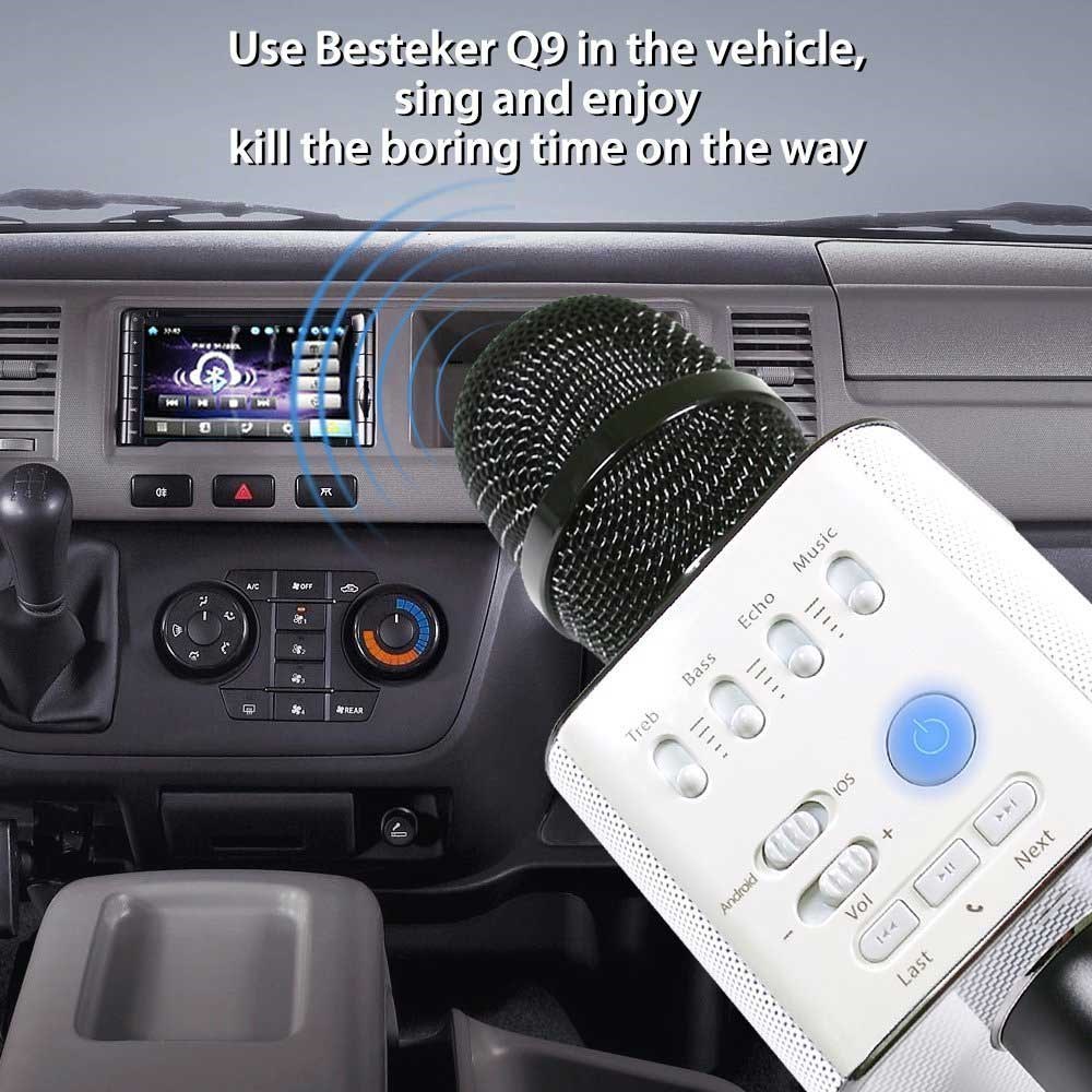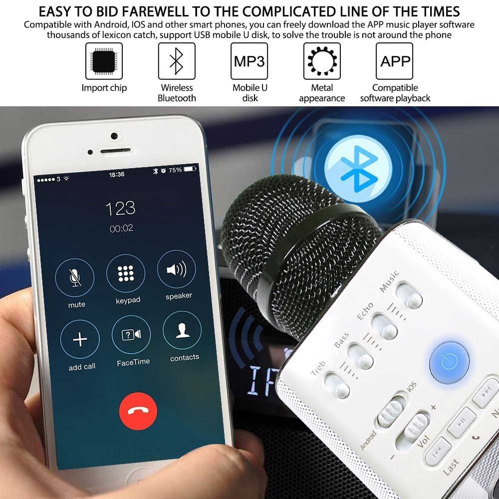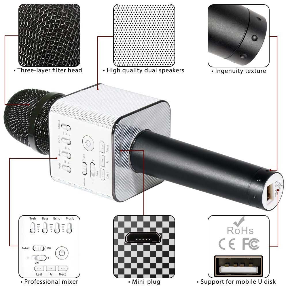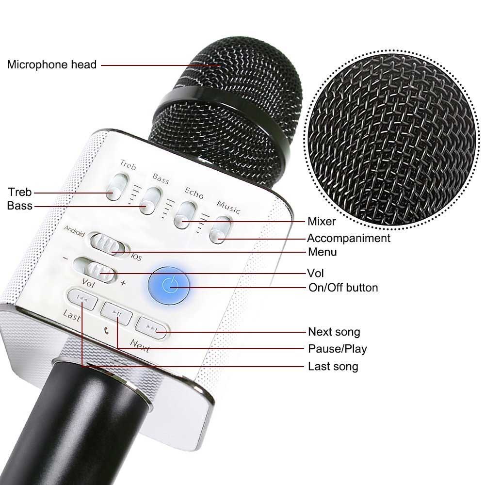 Q9 The microphone is of high quality in both sound and design. You mix the sound yourself with the many adjustment buttons and can easily switch between songs. Download music player App and connect via Bluetooth The microphone to your smartphone and you can sing karaoke to the lyrics of your phone.