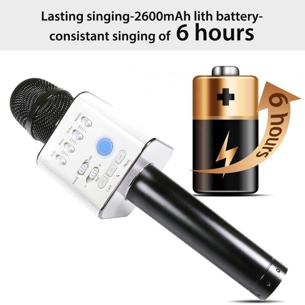 The microphone has a battery LED indicator which goes off upon charging and you have approx. 6 hours of song in one charge. Compatible with iOS and Android and can be used with iPhone, iPad, iPod, PC, Samsung and other Bluetooth enabled devices. The microphone is stored in a beautiful black case with a carabiner for hanging.
