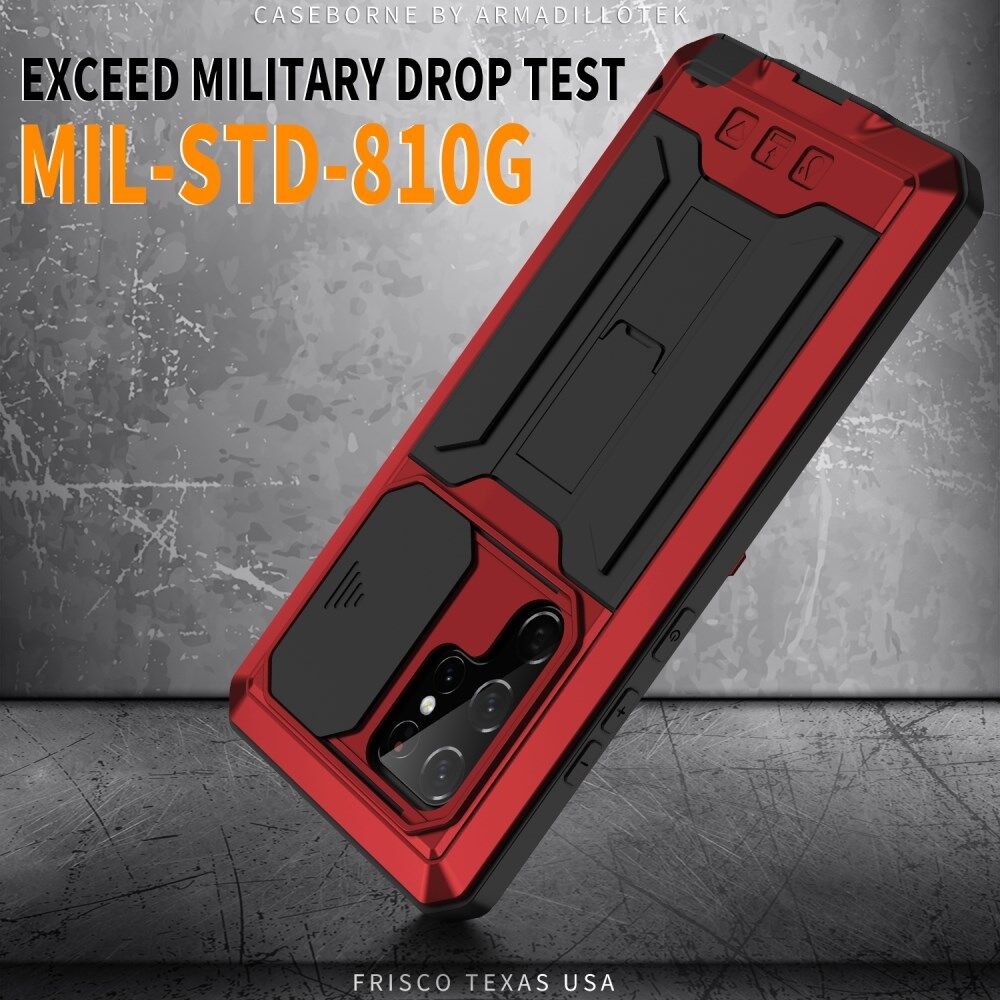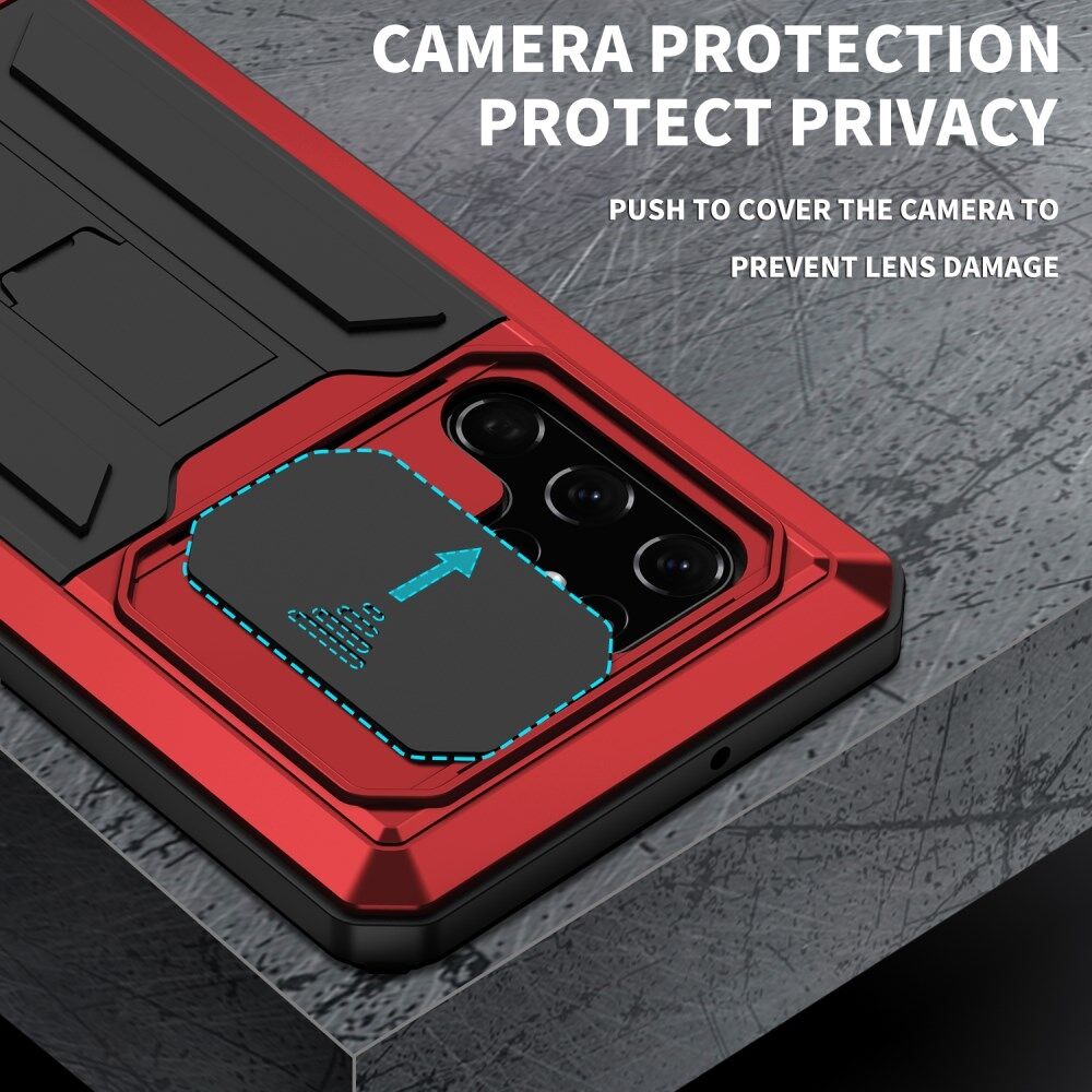 R-JUST 2nd Generation for Samsung Galaxy S22 Ultra 5G Phone Case Sliding Camera Cover Anti-drop Phone Cover Kickstand with Built-in Tempered Glass Screen Protector - Red