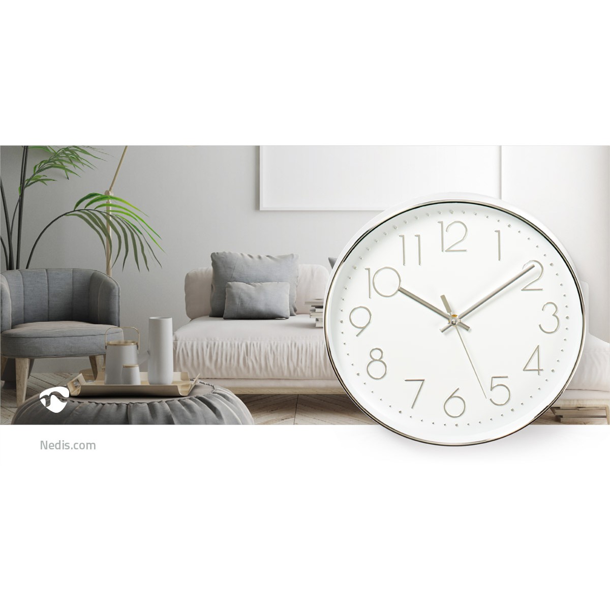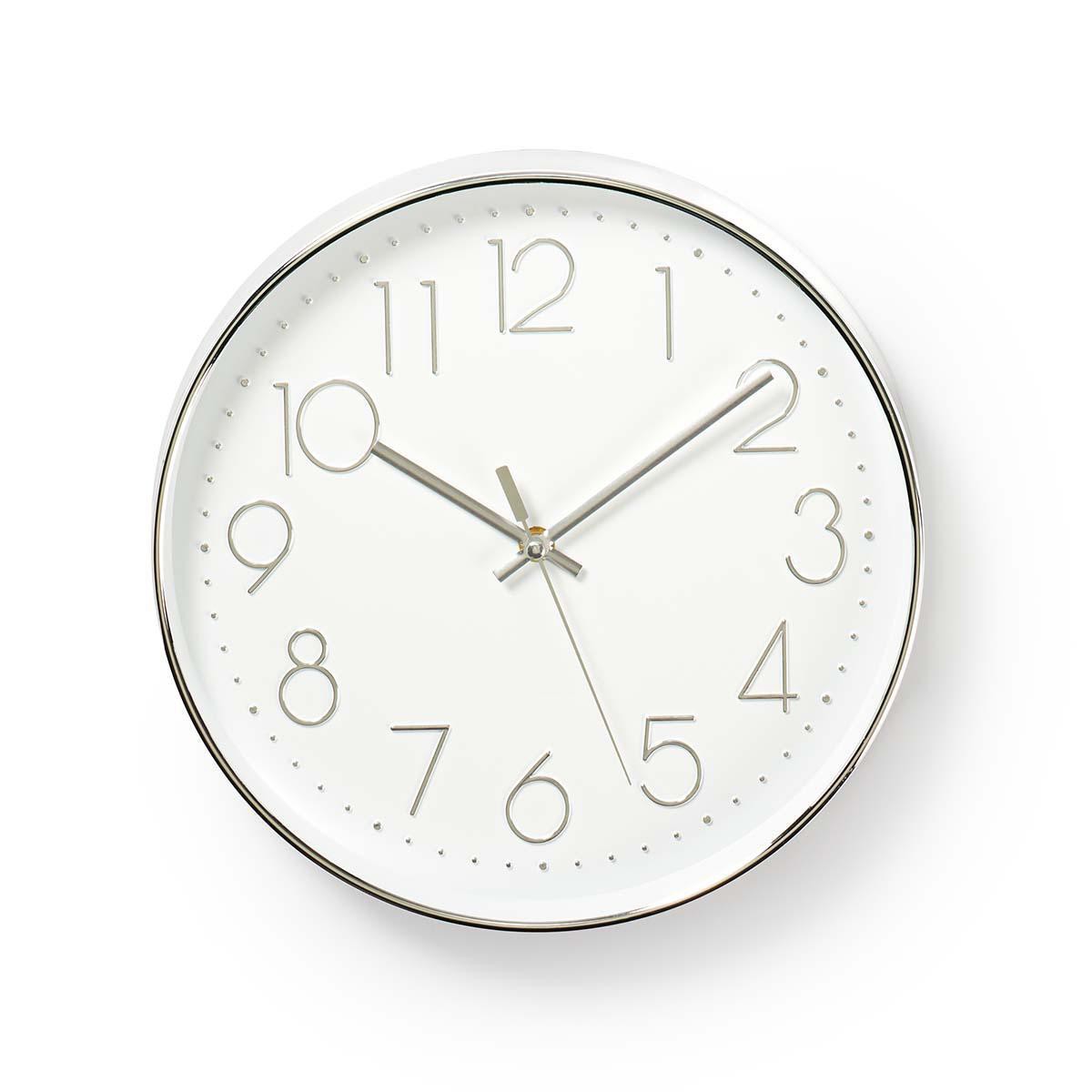 This round Nedis® alarm clock combines simplicity, style and easy-to-read, large numbers and highlights silver colored features against a white background.