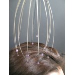 A metal design that has 12 long legs with plastic pins to stimulate the nerves in the scalp.