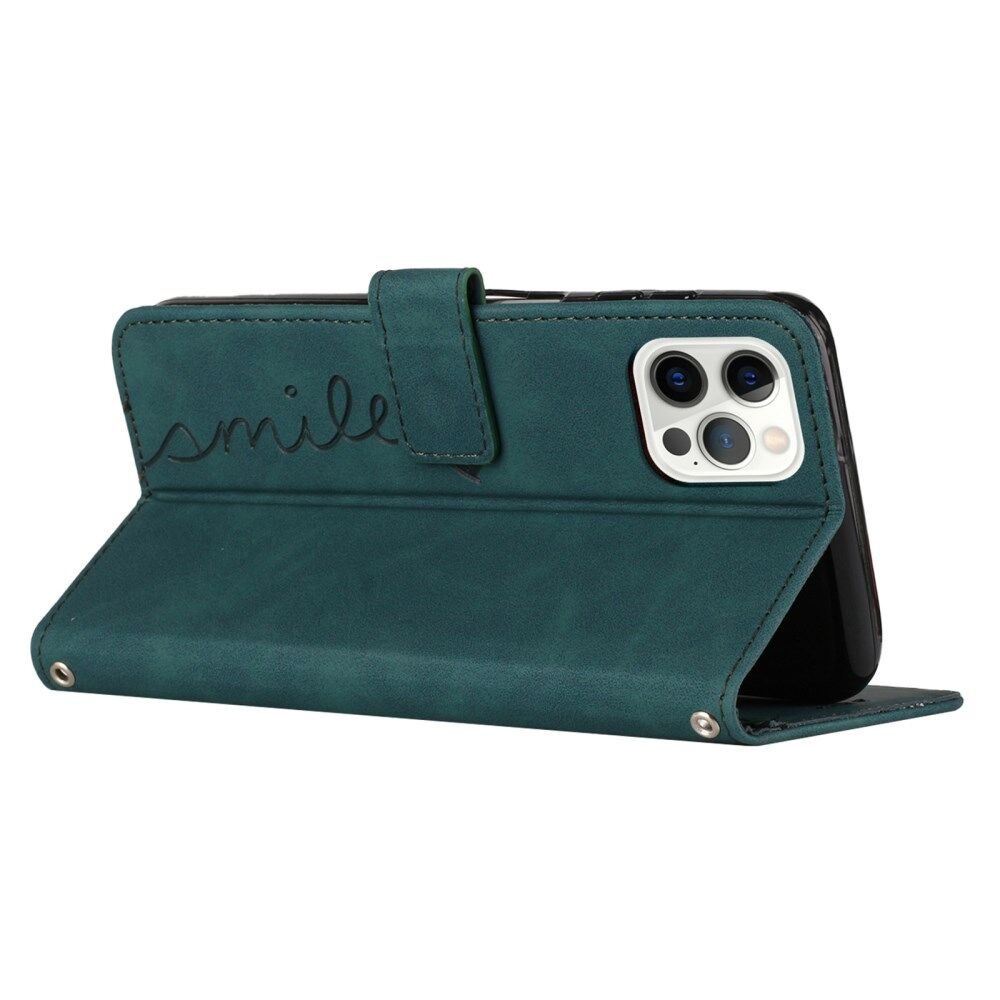 Skin-touch Feeling Case for iPhone 14 Pro, Heart Shape Imprinted Wallet Stand PU Leather Phone Cover with Shoulder Strap - Green