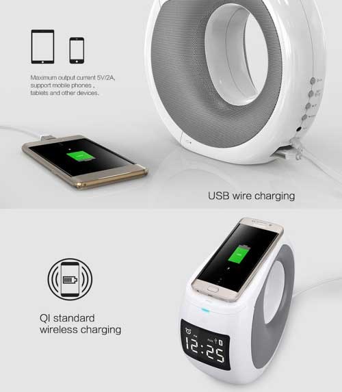This Speaker also has wireless charging of your smartphone if it has Qi function.