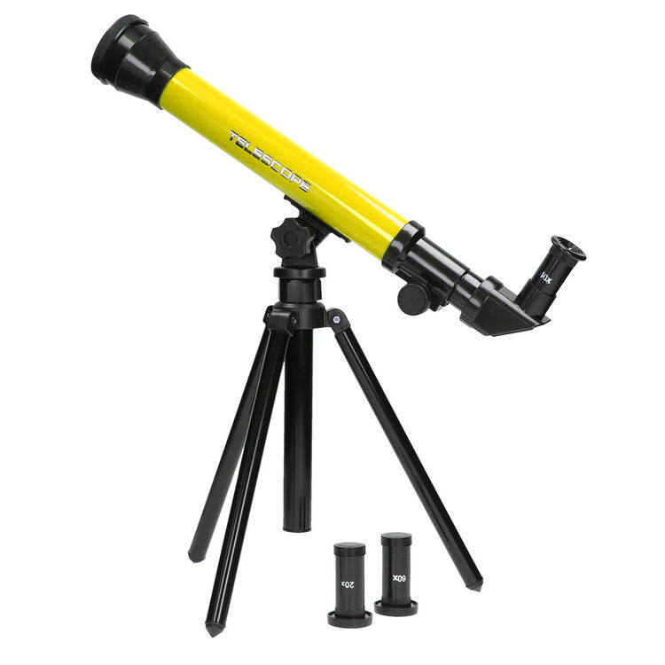 Get a closer look at the stars with this yellow telescope on a stand. Place one of the 3 different attachments on the telescope and discover the galaxy. The telescope has a 30 mm objective and is adjustable in position. This way you can view all corners of the universe. The telescope is made of sturdy plastic and stands on a stand of approx. 30 cm.