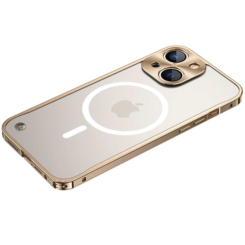 Tempered Glass + Metal Hybrid Scratch-resistant Phone Case Matte Transparent Protective Cover with Magnetic Wireless Charging Feature for iPhone 13 mini 5.4 inch - Gold