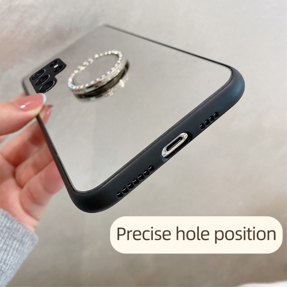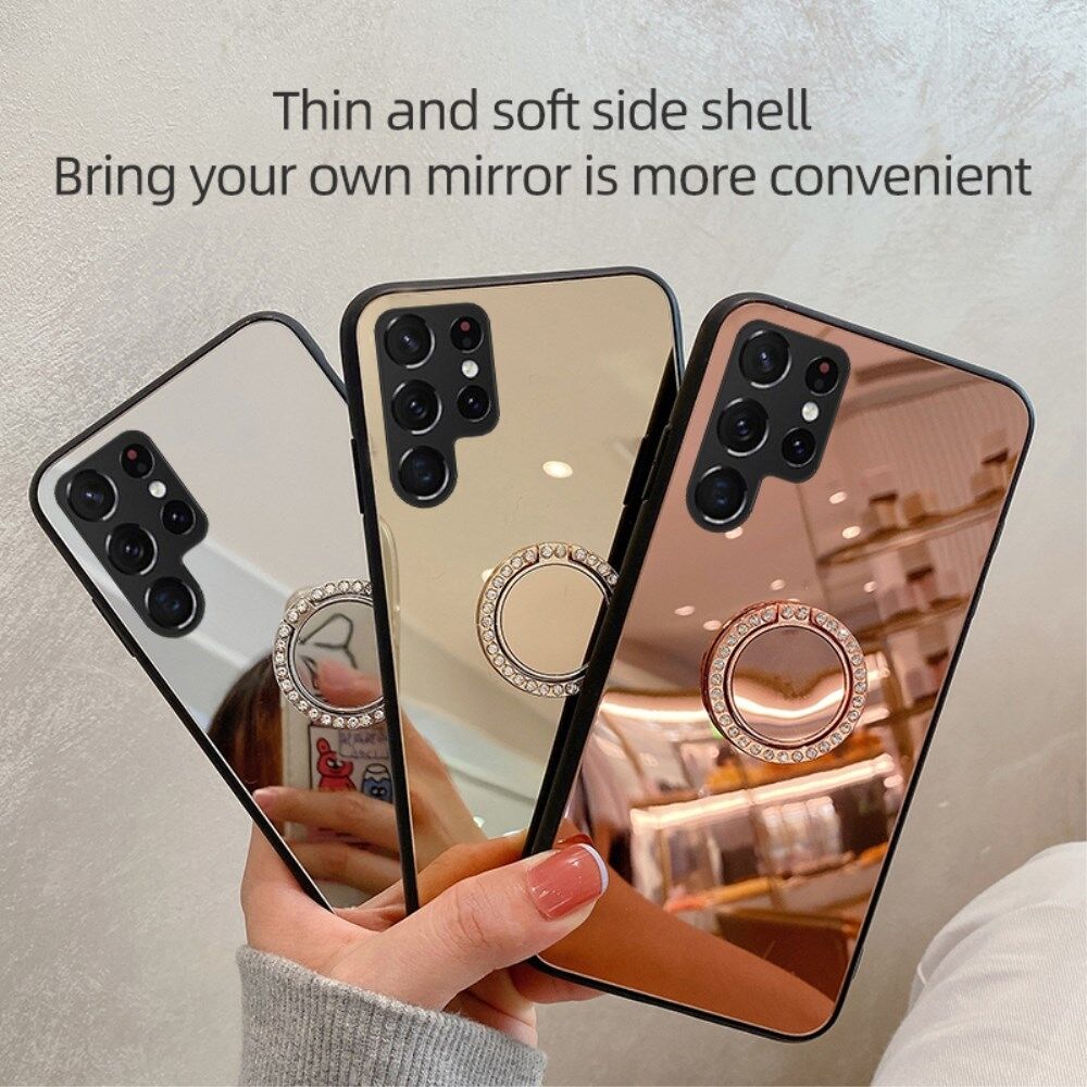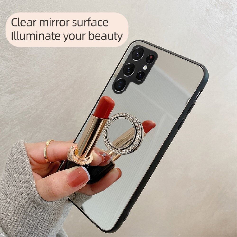 TPU Frame + PC Back Mirror Surface Ring Kickstand Design Protective Hybrid Cases for Samsung Galaxy S22 Ultra 5G