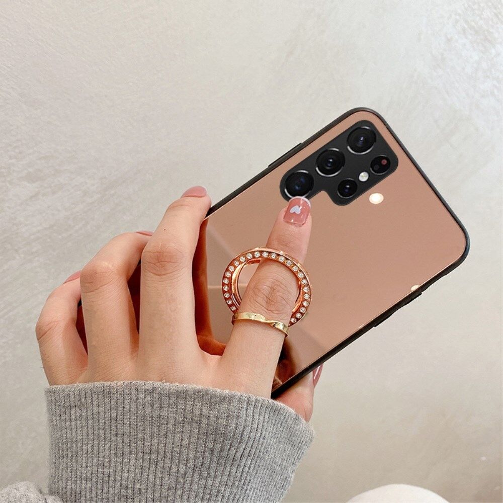 TPU Frame + PC Back Mirror Surface Ring Kickstand Design Protective Hybrid Cases for Samsung Galaxy S22 Ultra 5G - Rose Gold