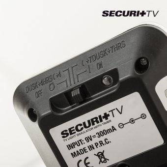 The TV simulator is plugged in and can be set to turn on and off automatically for 4 or 7 hours.