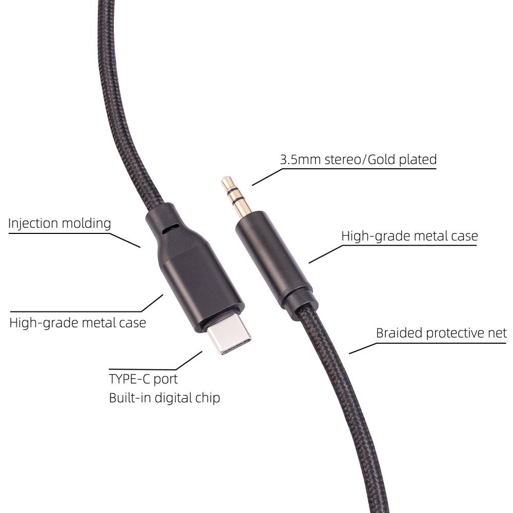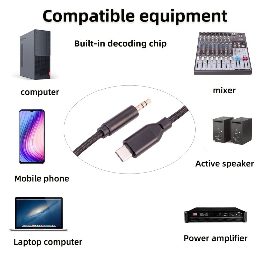 • This cable can directly transmit the stereo audio of Type-C mobile phone/tablet/laptop to active audio equipment (such as active speakers, power amplifiers, mixers) with a 3.5mm input interface, no audio converter is needed, For example, connect the mobile phone to the AUX audio input interface of the car, connect for iPad Pro to the power amplifier, connect the MacBook to the active speaker, power amplifier, connect the tablet to the active speaker, power amplifier, etc