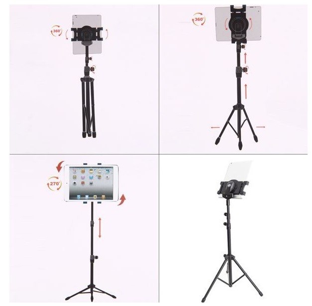 Tablet Tripod with high quality adjustable legs and made of delicious materials. With several adjustable heights from 70-120 cm and a Multi-directional holder with 360º rotation, the application possibilities are many. A perfect solution in the office, seminar or home if you watch movies in bed and want to avoid damaging your iPad when you fall asleep. A lightweight and smart holder where you can easily and quickly mount your tablet. A practical carrying case is included.